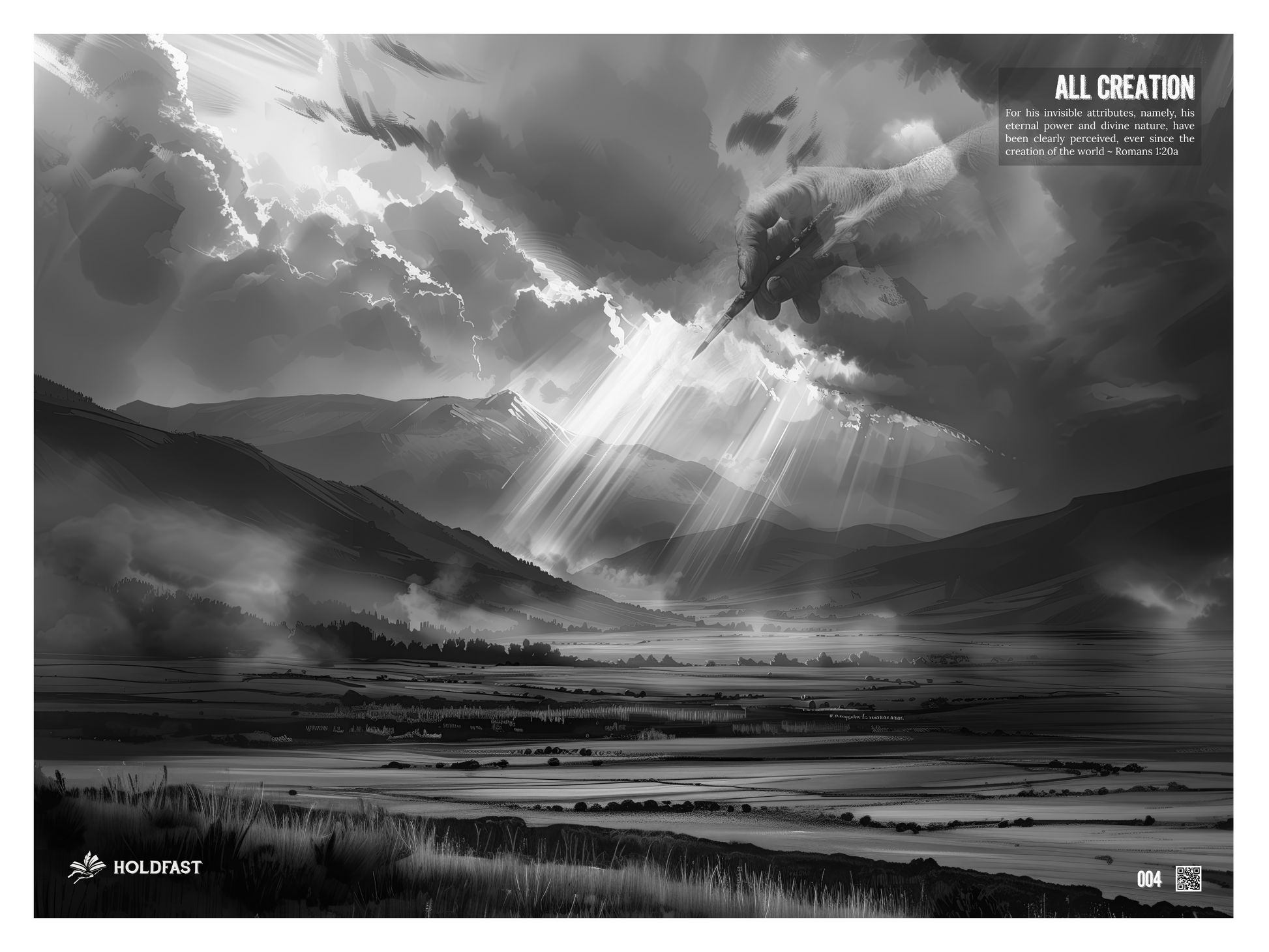 This artwork is a meditation on the glory of God revealed through the natural world. It reminds us that what often feels ordinary or random is, in fact, purposeful and designed. His eternal power and divine nature are not hidden—they are woven into every sunrise, every hillside, every storm.
