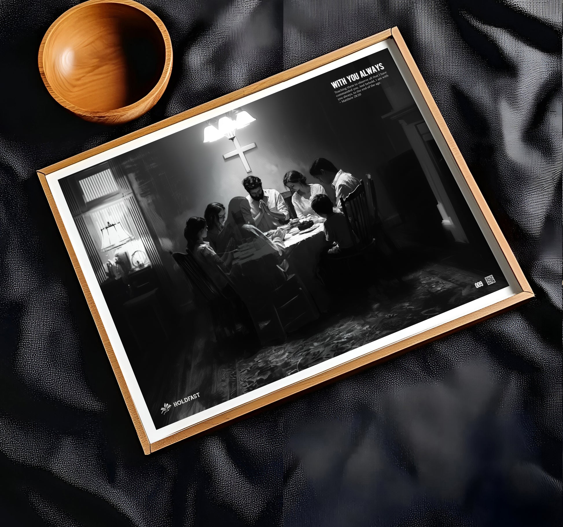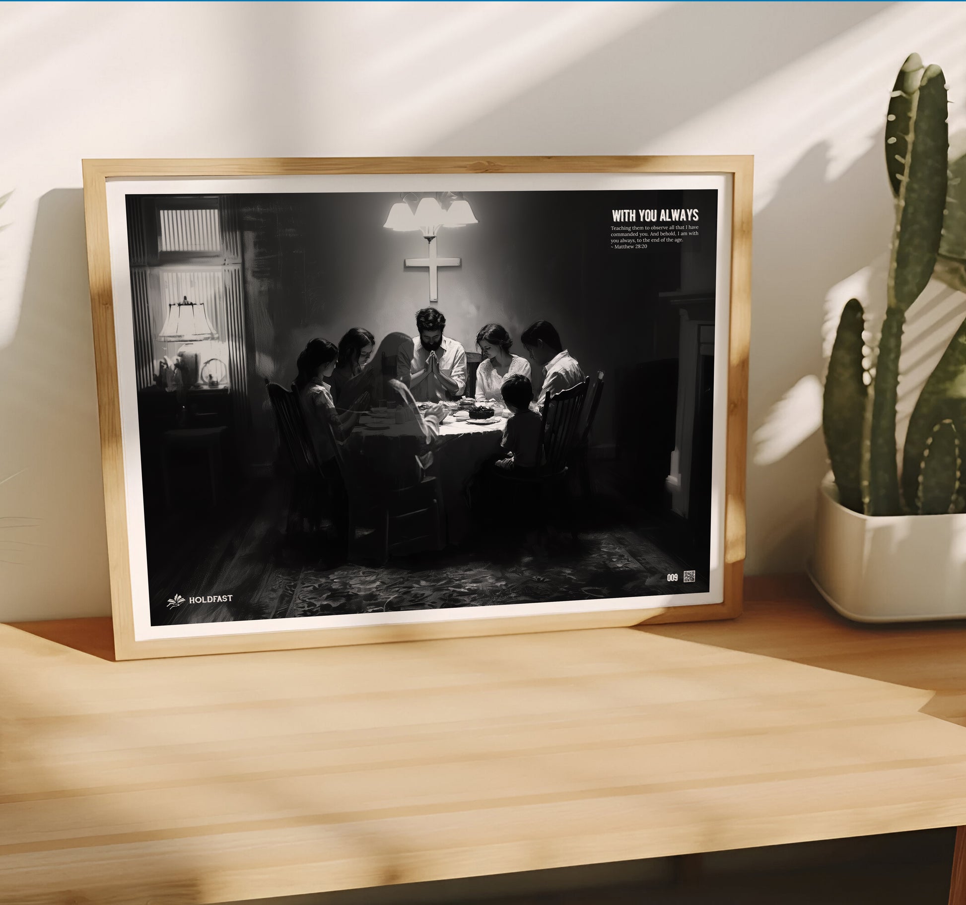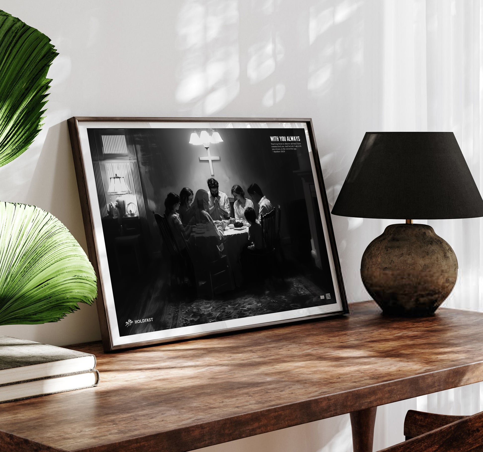 This artwork brings to life the enduring promise of Jesus: that He is with His people always, even in the smallest of gatherings and simplest of routines. The afterimage reminds us that faith is not a private act. It is a relationship sustained by the constant presence of the risen Lord.